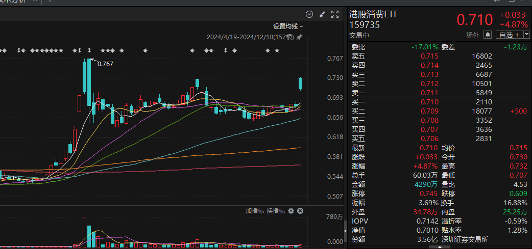 相关ETF方面,港股阔绰ETF(159735)涨近5%,相关因素股涨多跌少,哔哩哔哩-W、雅迪控股涨近6%,滔搏、金沙中国有限公司、安定汽车、中国飞鹤、同程旅行等涨幅居前;珍酒李渡、想摩尔国外、东方甄选等下落。